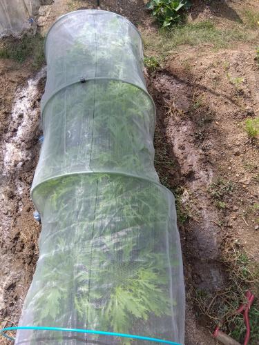 液肥は与えていない。 だいぶ大きくなってネットいっぱいになってきました。 水菜の両サイド(畝間)に有機石灰を散布して耕し、水やりしました。 植付時に石灰はやっているが、念の為。