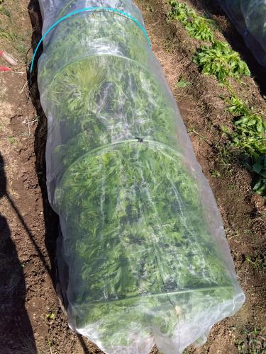 ミズナ、一株が腐りました。軟腐病かな。 防虫ネットの両端を土から出して固定しました。