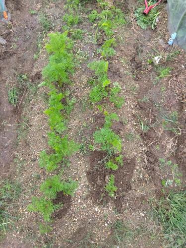 ニンジンは5cmくらいになるように間引きしました。 間引きしたものは、かき揚げの材料にすると美味しく食べられますが、ニンジンとピーマン嫌いなうちの嫁さんが作ってくれるはずがない。なので、今までは廃棄していました。 ところが、意外とスラッと根っこが伸びているので、植えてみようと考え、スコップ(移植ゴテ)を挿して隙間を作り、できた隙間にニンジンを挿入、土を寄せて水やりしました。どうなるか楽しみができました。