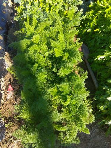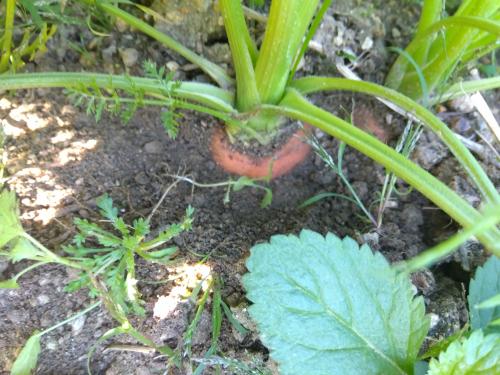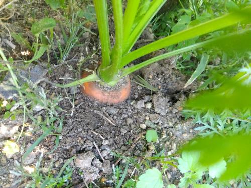 ニンジンの出来具合を観察しました。 写真のニンジンは第1弾ではないかと思います。発芽不良で追加まきが第2弾。第2弾は2cmくらいです。 間引きが徹底されている所とされていない所があるので、徹底されていない所は本来の太さよりも細くなるでしょう。今からは間引きしません。