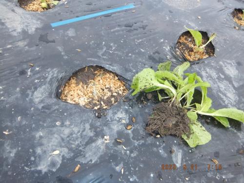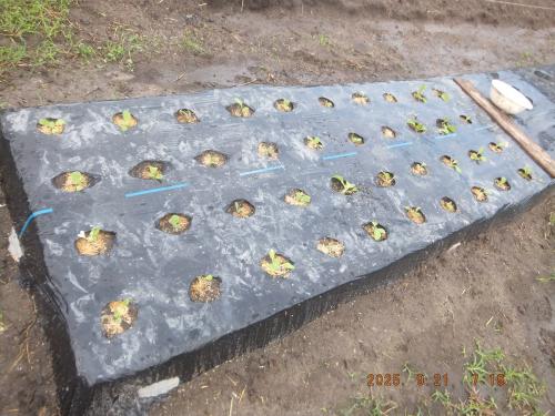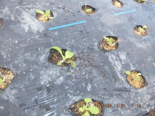 先日 畝にミニハクサイ苗を直接植え付けしましたが・・・ 昼間の暑さで4か所ほど不発が発生しましたので 予備苗を植え付けしました!