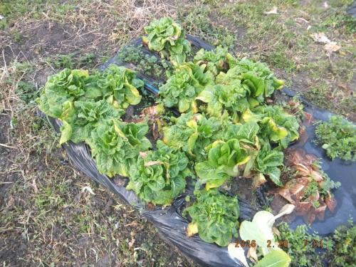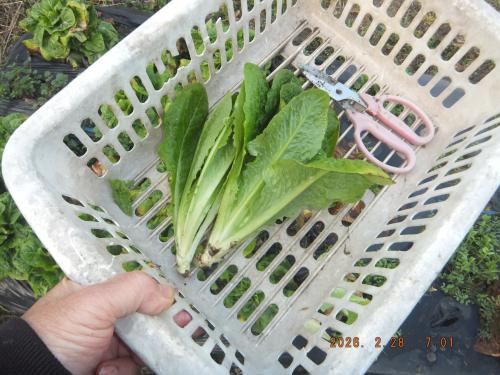ロメインレタスを収穫しました→自宅用 昨年からの栽培物・・・ 寒波でダメージを受けて商品にはなりませんが 自宅用として部分収穫が可能です