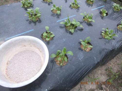 チンゲン菜畝の間引き 化成追肥 土寄せを行いました!