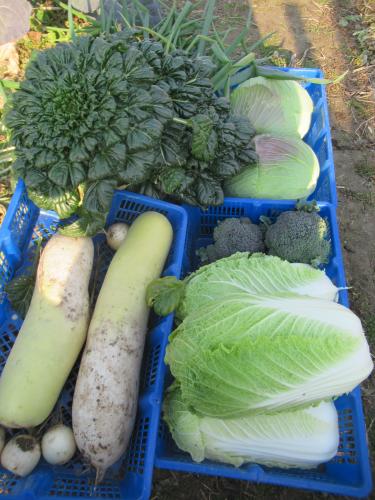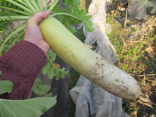 大きいものを二個収穫しました。 他の大根はトウ立ちを遅らせるために中心の葉を切りました。