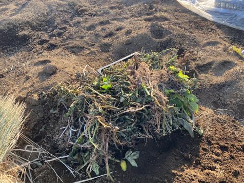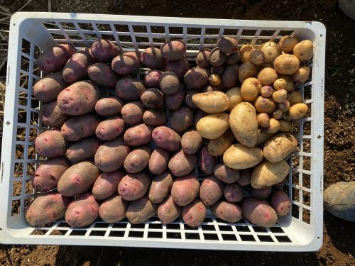 先週末に掘り上げようとしてたけど、午前中まで雨天で延期になりました。 さすがにもう霜が降りてそうなので、まだ半渇きの土ですが掘り上げます。 やはりインカは全然ダメだったけど、ペチカとワイスはまぁまぁの大きさ。 これだけあれば来年度の春ジャガにも回せそうなので、良かった良かった♪