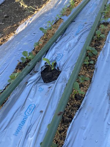 のロメインレタスを定植しました。 植えた場所はジプシーモードというか、 害虫忌避効果を期待の混植です♪♪♪ 、、、葉菜類5畝とブロッコリー畝に植えました。 、、、本葉2枚レベルの幼苗ですが問題なしです。 あとは放任の手間イラズ(^。^); 炒めてヨシ、鍋にヨシ、もちろんサラダ。