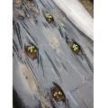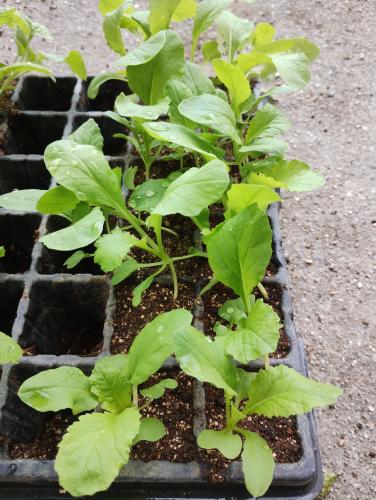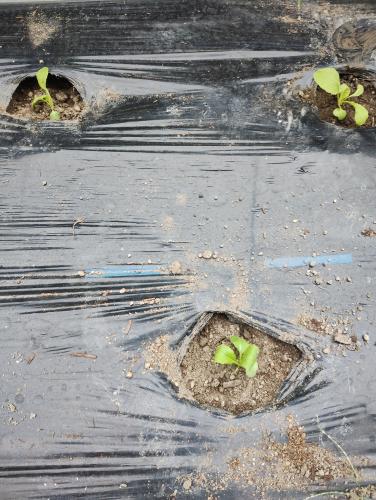 育苗した聖護院かぶの苗を定植(株間40cm、2条千鳥)し、米糠トラップと防虫ネットを設置しました。
