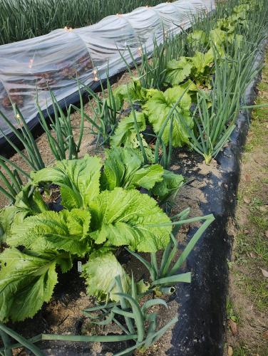 四川児菜(子持ちタカナ)の傷んだ葉を摘葉し、追肥(発酵鶏糞+米糠+菜種油粕+有機石灰+魚粉)しました。