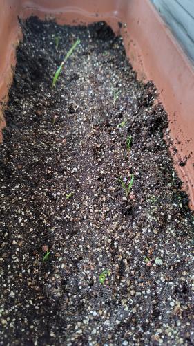 寒くて発芽しないので リビングにポットを持ち込んで 発芽したのをベランダのプランターに植えている。 コツコツと移植して おかずになるくらいに育つかな。 ままごとだ。