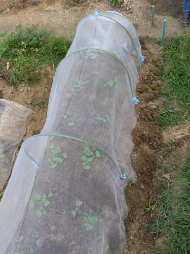 発芽がそろったダイコン、形の悪いものを中心に間引きを行い、軽く土寄せしました。ダイコンのエリアはカブと同じ畝ですが、土は柔らかかったです。