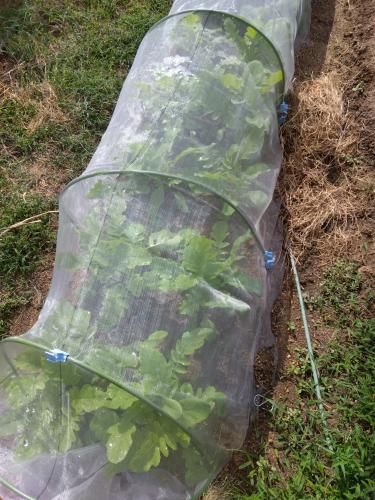 葉柄が黄緑色をしているので窒素不足と思われる。トウモロコシに大量投入した尿素はどこに行ったのか? 現代農業の緑肥の特集を見直していたら、トウモロコシはC/N比が40以上と炭素が多く窒素肥効は期待できないと書いてあった。なので、やっぱり肥料不足で液体肥料を投入した。その後に薬剤散布。