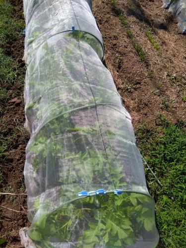 ダイコンを最終間引きをしました。 そのあと、有機化成肥料を1ヶ所指3本でひとつまみ株元にまきました。 更に、ついでですがアファーム乳剤を散布しました。 なお、間引き菜は廃棄しています。