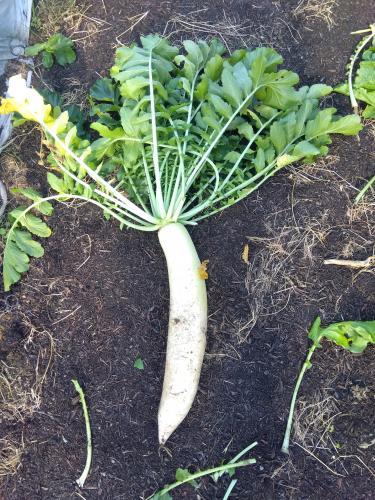 ダイコン。収穫しました。 今までは三太郎とかの短いダイコンを栽培していましたが、今回は普通の長さのダイコンに挑戦。長さ45cm(自宅で計測)の立派なダイコンを収穫できました。 ちなみに2本立てです。もう一つも同じ太さしています。