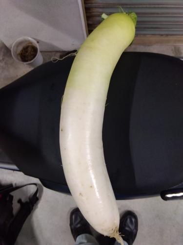 冷蔵庫の在庫がなくなりましたので、仕事からの帰宅途中に貸し農園に寄って収穫してきました。 ダイコンが曲がっているのは2本植えの弊害です。ダイコンがお互いに干渉しないように避けているのです。 賢いダイコン。