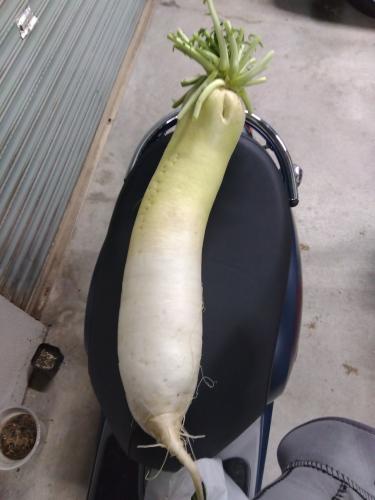 帰りに立ち寄ってダイコンを収穫してきました。 レジ袋に入れて原付バイクのハンドル下フックに引っ掛けて持って帰りましたが、重くてレジ袋が裂けそうでした。