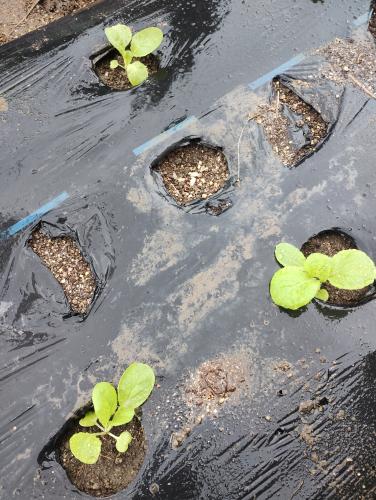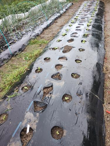 食べ切りぎっしり白菜の苗を定植(株間30cm、2条)し、防虫ネットを設置しました。