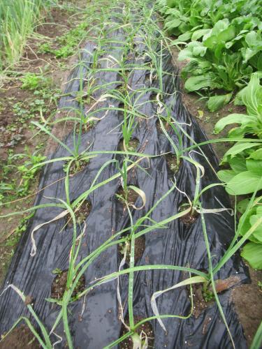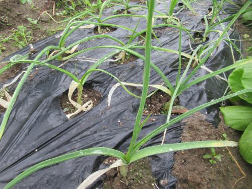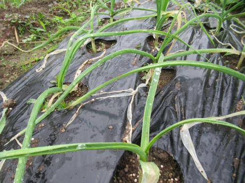 一回目の追肥をしました。 今年のニンニクは葉の色が薄く、黄色く枯れた葉もあり、あまり順調ではありません。