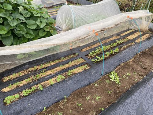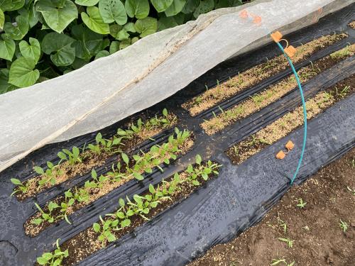各所、発芽しています。 未発芽ゾーンは再播種し、発芽ゾーンは間引き作業です。 モグラ凹が酷くてイラっとするが、何とか採れそうな感じ。