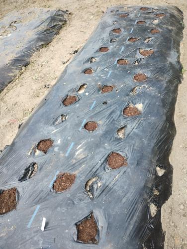 ロメインレタスを播種(株間40cm、3条千鳥、点蒔き)し、被覆(牛糞堆肥&不織布)しました。