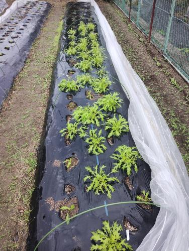 細葉千筋京水菜を間引き、欠株部に移植、追い蒔きしました。