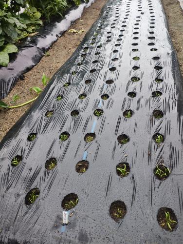 ナチュール(ほうれん草)が発芽しました。不織布を撤去し、防虫ネットを設置しました。