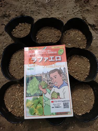 冬の収穫を目指してポットに種まき。 まだまだ暑い毎日なので日陰に設置、土は庭の土と野菜の土のブレンド。 品種はラファエロ。 花蕾は鮮緑色で、よく盛り上がり品質が良いとの事です。
