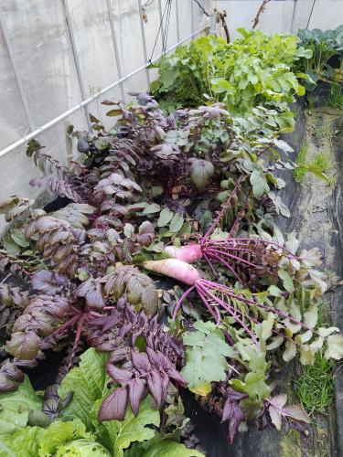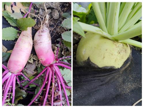 女山大根が大根らしくなっておりました! 葉っぱばかり立派で、あぁ今回もまた細根だわと思っていましたが、これは大根と言ってもいいでしょ? お隣の聖護院も丸っと土から顔を出しています 全然お世話していませんがありがたく収穫させていただきます