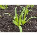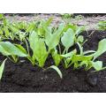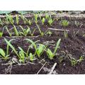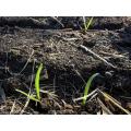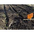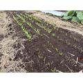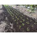 15cm間隔4列で約20行で直径8cm位の穴をあけ、5粒/穴で種まき。