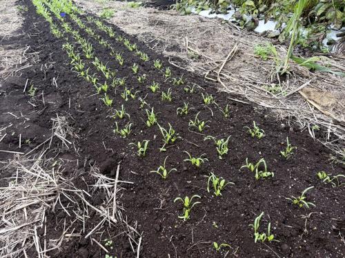 先に芽を出した株の一部が本葉を出し始めた。 エコマスターBT(第21944号)カリグリーン(第18358号)ダイン(第4951号)1000倍希釈液散布。