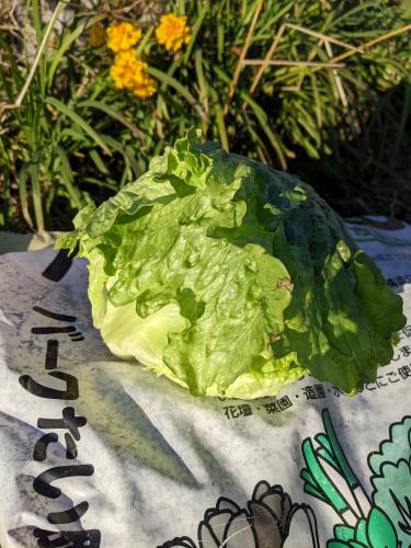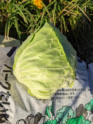 第1畝のキャベツ初収穫 いつもの初秋に比べると 少し頭が尖っているので おそらくこちらが秋徳で 盗られた方が初秋だろう 混色してたレタスも収穫