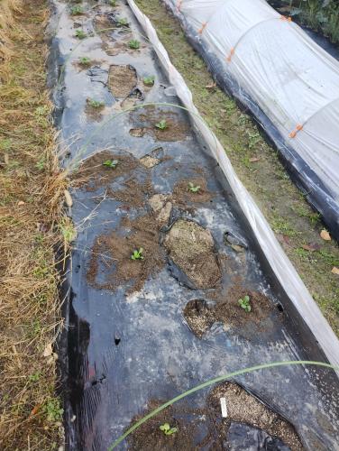 タアサイを定植(株間60cm、2条千鳥)しました。ビニールトンネルを撤去し、苗ガードを設置しました。