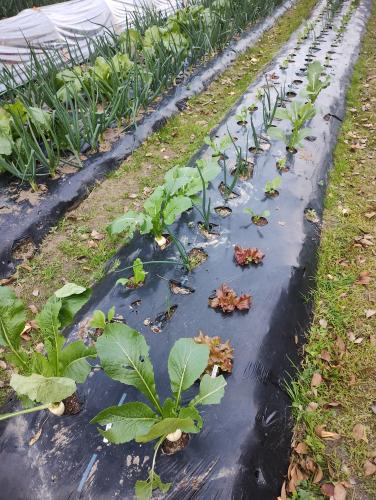天王寺蕪の防虫ネットを撤去し、追肥(発酵鶏糞+米糠+菜種油粕+有機石灰+魚粉)しました。