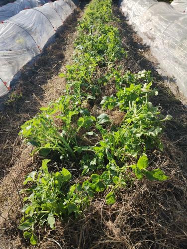 メークインのビニールトンネルを撤去し、刈草で被覆しました。