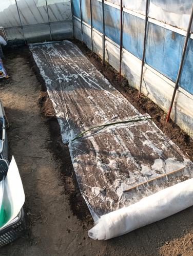 新年の種蒔きは小松菜からです 先日、半分収穫が終わった跡地に再度播種 播種後には寒いので不織布をかけて発芽待ち ハウス栽培だけど深夜は寒いので発芽までは 一週間はかかると思います