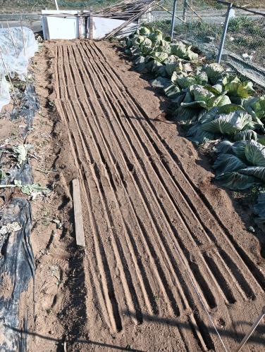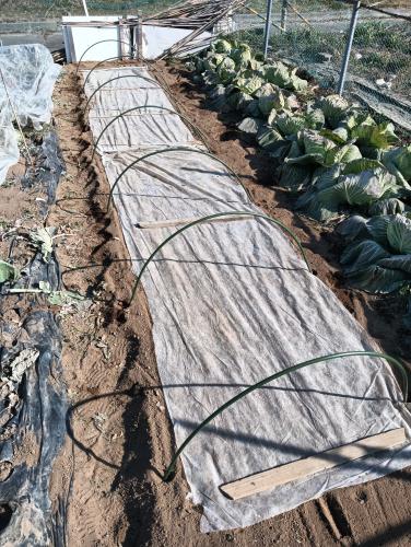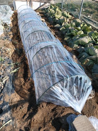 昨日までキャベツを栽培していた畝を 速攻で耕耘して種蒔き 欲張って9条蒔きですww ただ今回は最初から失敗! ビニトンが換気孔が4個なんです この時期なら密閉か少ない穴数ですよね たぶん、これじゃ温度上がらない どうしよう、ガムテープで穴を塞ぐか