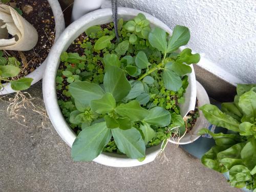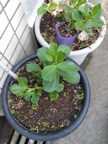 自宅プランターに植えているソラマメです。貸し農園からあぶれた子を植付しました。元肥は千日紅の残渣のみです。 貸し農園では、ひと株につき6〜8本の脇芽を伸ばしますが、プランターの場合は根域が限られるので3本だけにしようと思っています