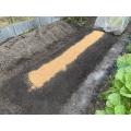 30cm間隔で8箇所に直径5〜6cm深さ2cmの穴を設け、各穴に4粒種を蒔きました。 畑には事前に苦土石灰と熟成牛糞、黒土、化成肥料を加えて、「こまめちゃん」で耕しておきました。 種は昨年の残りを使いました。