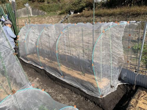 40cm間隔で8株定植しました。畑には事前に苦土石灰と熟成牛糞、黒土、化成肥料を加えて、「こまめちゃん」で耕しておきました。 寒いので籾殻も撒いておきました。 寒冷紗と透明マルチを使い、猪対策のフェンスも活用して、変則的な霜除け用のカバーも掛けました。 これで万全です。
