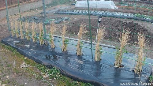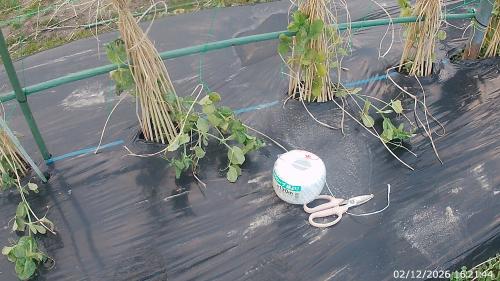 風と寒さでダメージを受け横たわってしまった スナップエンドウを紐で誘引しました!
