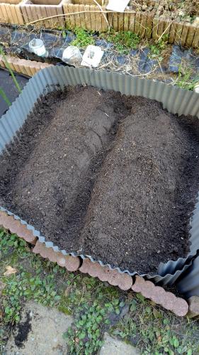 種まいたけど全く発芽の気配なし。 ダメなら苗を買おう。 先日耕したオクラの土に バーク堆肥と腐葉土と赤玉土を混ぜて 2つ畝を作った。 化成肥料は冬越しするのに邪魔になるって。 だから春に苗が冬越ししてから追肥しようと思う。 まずは発芽だ。