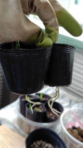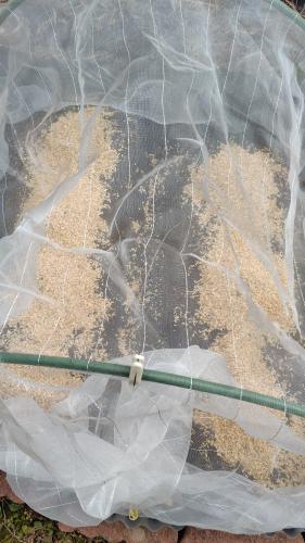 水をあげようと黒ポットをもちあげたら ビローンと長い根が出ていた。 全部のポットから根が出ていた。 1個しか発芽してないポットからも 3本根が出ていた。 発芽したばっかりのくせに 根がめっちゃ長い。 こりゃ、もう定植しよう。 庭に埋めて もみ殻をたっぷりまいて ヒヨドリやハトに食べられないように防虫ネットで覆った。