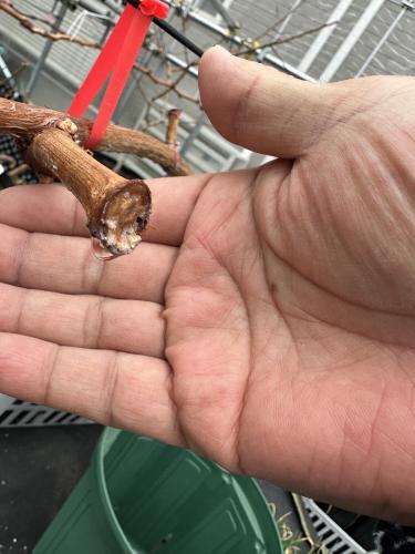 あちこちから水揚げの報告があったので今朝見てみたら… 我が家でも水揚げが始まっていました。 ただ、巨峰は滲む程度、天狼はまだ…巨峰系が遅い。 シャイン系、BKはポタポタ垂れてました。