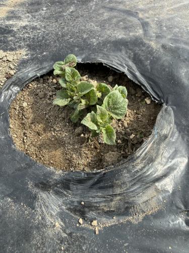 ジャガイモの芽が出てきたのでマルチに穴を開けた。 一つの畝は先にマルチを張ってから芋を植えていた。