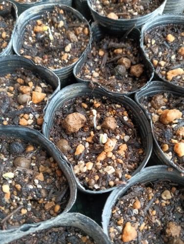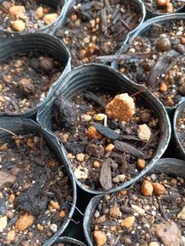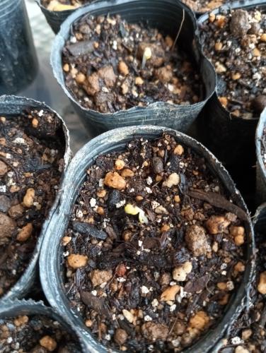まだ数える位ですがポチポチ発芽中です 播種から3日目で発芽です 後2日位待てば発芽完了すると思います