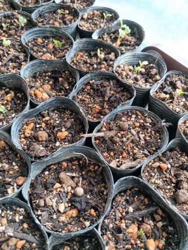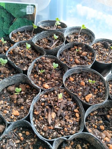 だいたい発芽したようです 発芽しない物が11ポット 発芽率80%なんで、まぁそんなもんでしょう 窓際で太陽に当てながら見守ります