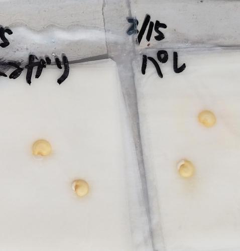 こどもピーマン、とんがりパワー、スイートパレルモが1つずつ発根し2/28に種まき。 更に3/1にとんがりパワーが1つ発根し種まきしました。 こどもピーマンは出張中に発根して、すぐに種まきできなかったので、しばらく濡れティッシュに入れた状態だったが、あまり根が伸びなくなり、色も変わってきたのでダメかもしれない。
