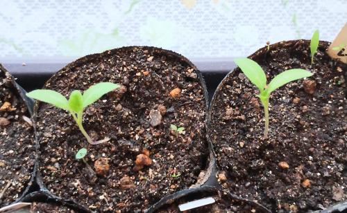 最初に発芽したひもなす2つとフィレンツェに本葉が出ました。