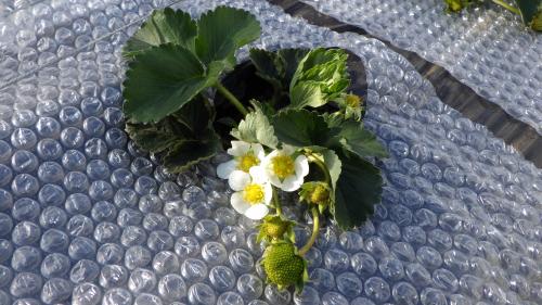 着果のイチゴ、プチプチで傷み防止です