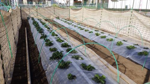 イチゴの実が着き始めました。自重での傷み防止のためにプチプチシートを畝に張りました。2条2畝に昨日、今日と2日の作業となってしまいましたが、収穫量が少しでも増えれば元も取れそうです。