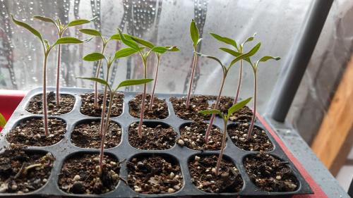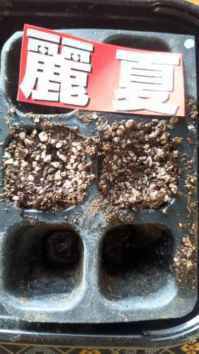 2粒が不良で他は良好。本葉が開いたらポットに取り上げます。タネを整理していたら2022年の麗夏が2粒出てきたのでダメ元で播種。
